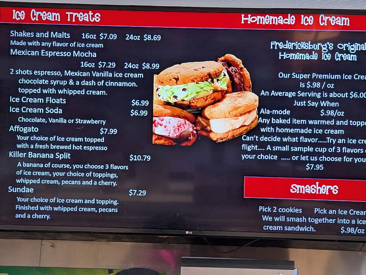 This was our first trip for my wife and I. She had the peach cobbler a la mode with vanilla ice cream. I had the bourbon snickers in a waffle cone and my son had cookies-n-cream in a cup. The ice creams were really good but a bit pricey. Well worth it to take a break from the hot summer Texas sun and enjoy a cold treat.